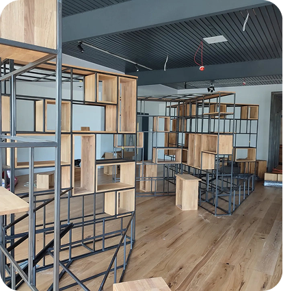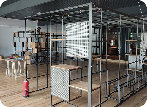 For this project, we designed a stylish bar made of steel tubes that perfectly matches the restaurant's modern concept.
